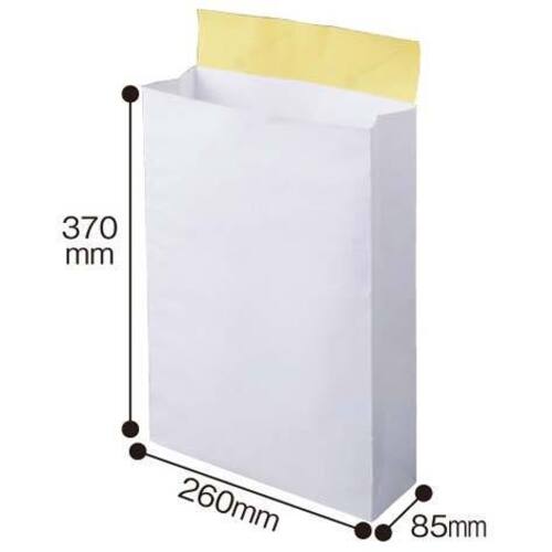 耐水加工で雨にも強い。白色宅配袋。●外寸法/タテ370×ヨコ260×マチ85mm●カラー/白●質量/上質紙90g/m2+PP20μm)●材質/フィルム貼り耐水加工●その他特記事項/ベロ・封かんテープ付●単位(入数)/1パック(25枚入) 【ご注意事項】※1パック単位でお申し込みください。