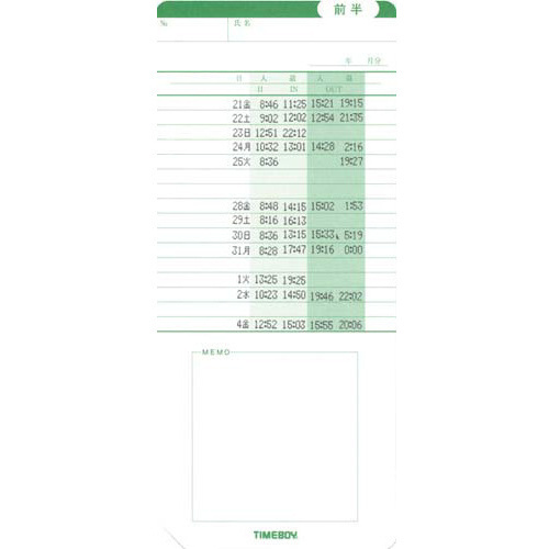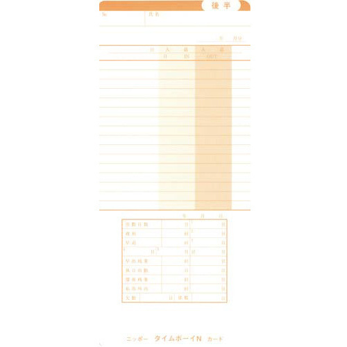 <まとめ買いでお得!>沢山使うオフィスやストックにちょっとお得な業パを!●タイムボーイ用●対応機種/タイムボーイ1・2・3・5・6・7・8・8プラス・ex4、カルコロ15・15ex・20ex・USB●単位(入数)/1セット(100枚入×3)【ご注意事項】※1セット(3箱・300枚入)単位でお申し込みください。※打刻印字専用のタイムカードになります。【返品に関するご注意】※開封後はお客様のご都合による返品はお受けできません。【デジタルカタログ】※こちらの商品のデジタルカタログページは、画像下のリンクからご覧いただけます。