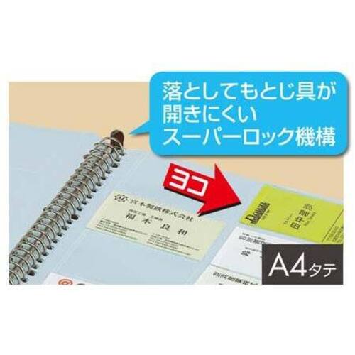 名刺整理には差し替え式の名刺ファイル。落としてもとじ具が開きにくいスーパーロック機構。●カラー/薄緑●仕様/500名分●サイズ/A4タテ●寸法/タテ312×ヨコ270×背幅33mm●ポケット内寸法/タテ57×ヨコ95mm●台紙枚数/25枚●最大収容枚数(台紙)/33枚●材質/表紙:再生PP50%、ポケット:再生PP●穴数/30穴●背見出し紙は抜き差し可能、インデックスシール12片付き、ヨコ入れ●単位(入数)/1箱(4冊入)【ご注意事項】※1箱単位でお申し込みください。