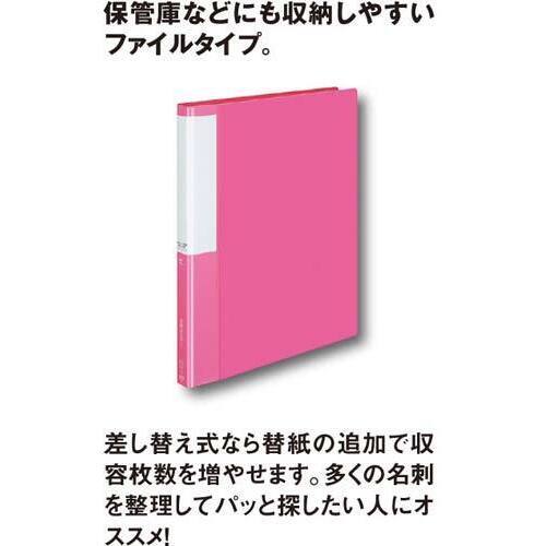 名刺整理には差し替え式の名刺ファイル。落としてもとじ具が開きにくいスーパーロック機構。●カラー/桃●仕様/500名分●サイズ/A4タテ●寸法/タテ312×ヨコ270×背幅33mm●ポケット内寸法/タテ57×ヨコ95mm●台紙枚数/25枚●最大収容枚数(台紙)/33枚●材質/表紙:再生PP50%、ポケット:再生PP●穴数/30穴●背見出し紙は抜き差し可能、インデックスシール12片付き、ヨコ入れ●単位(入数)/1箱(4冊入)【ご注意事項】※1箱単位でお申し込みください。