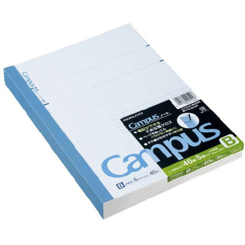 コクヨの定番キャンパスノート。独自の原紙基準により快適な書き心地をさらに追求!目印によりノートに線が引きやすい!背にタイトルが書ける!●仕様/B罫35行40枚●寸法/タテ252×ヨコ179mm(セミB5)●罫/6mm幅中横罫●製本様式/無線とじ●単位(入数)/1セット(5冊入) 【ご注意事項】※1セット単位でお申し込みください。※より詳しい商品詳細は参考情報ページ(1)をご覧ください。【デジタルカタログ】※こちらの商品のデジタルカタログページは、画像下のリンクからご覧いただけます。