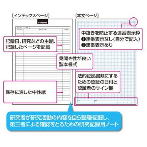 研究者が研究活動の内容を自ら整理・記録し、第三者による確認をとるための研究記録用ノート。高級感のあるハードカバータイプ。ノート側面に特殊なパターン文字が入った改ざん抑止機能つき。●サイズ/A4●仕様/スタンダードタイプ●寸法/タテ297×ヨコ210mm●枚数/80枚(扉1ページ、説明2ページ、インデックス5ページ、本文152ページ)●罫/5mm方眼罫・署名欄付●製本様式/糸がかりとじ●材質/表紙:板紙、中紙:上質紙●単位/1冊※より詳しい商品情報は、参考情報ページ(1)をご覧ください。