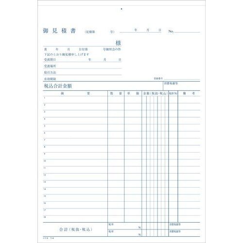 B5タテ型見積書です。カーボン紙を挿入してご使用ください。エコノミータイプ ●寸法/タテ263×ヨコ182mm●行数/18行●組数(1冊)/50組●単位(入数)/1セット(5冊入) 【ご注意事項】※1セット単位での販売になります