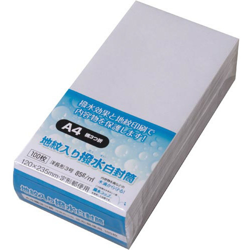 撥水効果と地紋印刷で内容物を保護します!●色/ホワイト●サイズ/洋0(長3横型)●寸法/タテ120×ヨコ235mm●坪量/85g/平方メートル●古紙パルプ配合率/古紙配合なし●貼り合わせ方式/内カマス貼●テープ・のり/アラビアのり付き●郵便番号枠/〒枠なし●仕様/裏地紋入●単位(入数)/1箱(100枚入×5) 【ご注意事項】※1箱単位でお申し込み下さい。