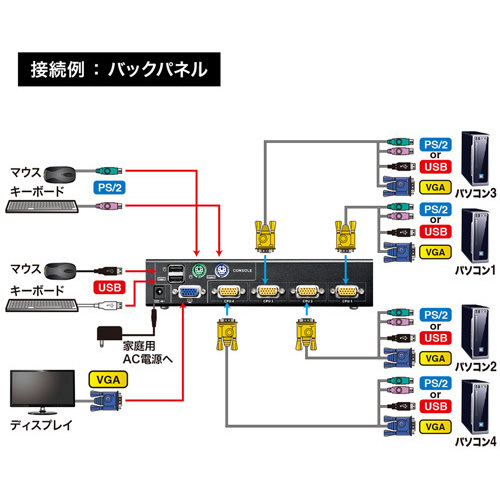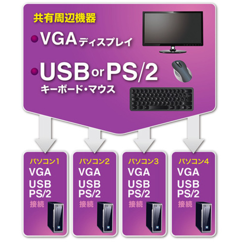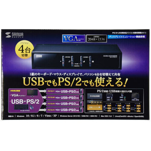 PS/2接続とUSB接続の両方に対応したデュアルインターフェース対応のパソコン自動切替器(4ポート)●1組のコンソール(キーボード・マウス・ディスプレイ)で4台までのパソコンを切り替えて操作できます。●パソコンとの接続はPS/2でもUSBでも可能。PS/2接続のパソコン、USB接続のパソコンを混在して接続することもできます。●キーボード・マウスはPS/2でもUSBでも接続できるデュアルインターフェースに対応しています。マウスはUSB、キーボードはPS/2などのクロスインターフェース接続も可能です。●キーボードポートエミュレーション機能を搭載。【ご注意事項】※こちらの商品は返品不可商品となります。※商品仕様につきましては、メーカーHPにてご確認ください。※仕入先直送品のため、在庫状況により上記のお届け目安にてお届けできない場合がございます。※詳細納期をご確認されたい場合は、0120-812-069までご連絡ください。(お問い合わせ受付時間)月曜日~金曜日9時から18時30分(祝日を除く)