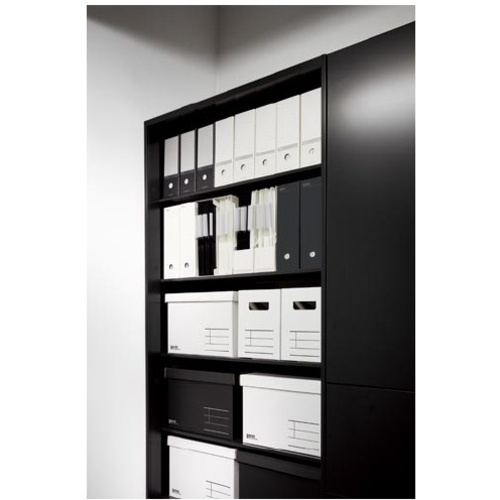 コクヨの〈NEOS〉シリーズ!両側面の切り込みで、縦置き・横置きの2WAYで使える!見出し面は、色分類とタイトル分類のどちらもしやすい機能的なデザインです。●サイズ/A4●外寸法/(高さ・幅・背幅)260・317・102mm●材質/段ボール(古紙パルプ配合)●仕様/ワンタッチ組み立て式●両面フィンガーホール付き●カラー/ブラック●単位/1個