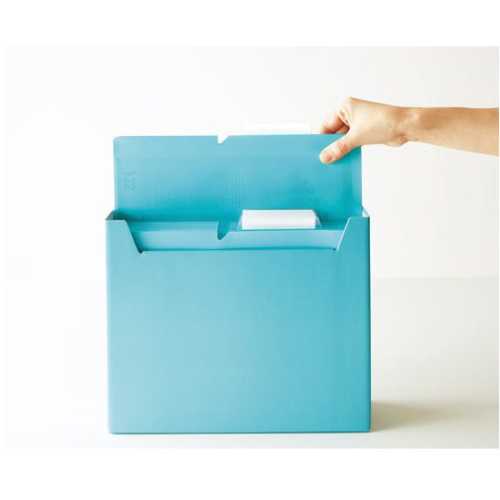 コクヨの〈NEOS〉シリーズ!両側面の切り込みで、縦置き・横置きの2WAYで使える!見出し面は、色分類とタイトル分類のどちらもしやすい機能的なデザインです。●サイズ/A4●外寸法/(高さ・幅・背幅)260・317・102mm●材質/段ボール(古紙パルプ配合)●仕様/ワンタッチ組み立て式●両面フィンガーホール付き●カラー/ターコイズブルー●単位/1個