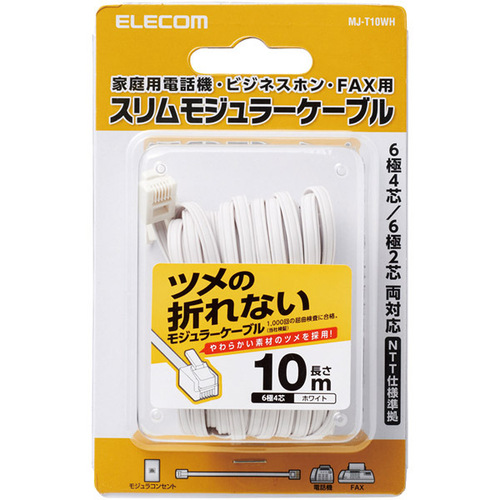 モジュラーコンセントと家庭用電話機・ビジネスホン・FAX・モデムなどを接続できる6極4芯タイプです。●屈曲に対する耐久性が高い新素材を採用し、通常の使用環境では絶対にツメが折れません。●1000回の屈曲検査に合格●ツメ折れによるケーブルの脱落が防げ、長期にわたってしっかりとモジュラージャックに固定することができます。●NTT仕様準拠の6極4芯タイプです。6極2芯の機器にも使用可能です。NTT仕様に準拠していない機器には使用できません。●せまい所でも配線しやすく、取り回ししやすいスリムケーブルです。【ご注意事項】※こちらの商品は返品不可商品となります。※商品仕様につきましては、メーカーHPにてご確認ください。※仕入先直送品のため、在庫状況により上記のお届け目安にてお届けできない場合がございます。※詳細納期をご確認されたい場合は、0120-812-069までご連絡ください。(お問い合わせ受付時間)月曜日~金曜日9時から18時30分(祝日を除く)