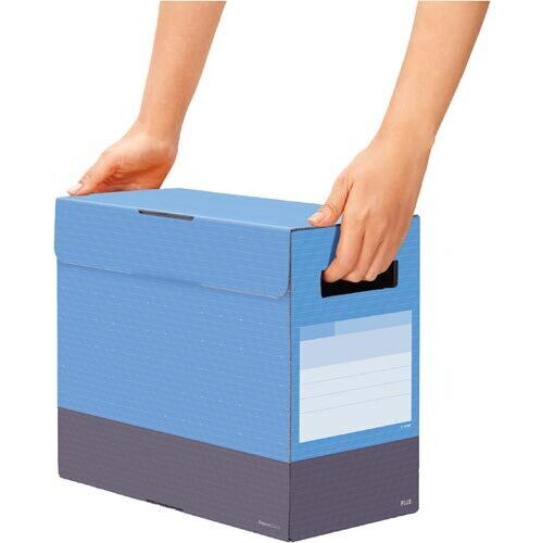 ほこりの侵入を防ぐフタ付きタイプ。しっかりした強度で重ねて保管もできる(2段まで)。持ち歩きにも便利。●サイズ/A4ヨコ●寸法/幅150×奥行318×高さ261mm●カラー/スカイブルー●材質/段ボール(古紙パルプ配合)●単位/1個