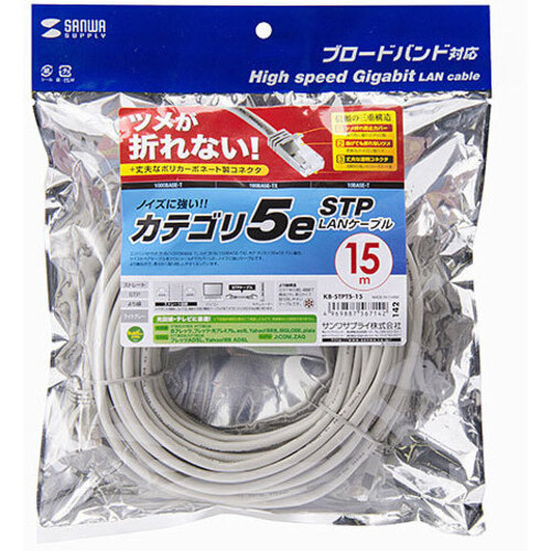 ノイズに強いシールドタイプ、ツメの折れないコネクタ採用のCAT5eSTP LANケーブル●長さ/15m●結線/より線仕様、ストレート全結線●色/ライトグレー●端子/RJ-45つめ折れ防止シールドコネクタ●規格/エンハンスドカテゴリ5(1000BASE-T)、カテゴリ5(100BASE-TX)、カテゴリ3(10BASE-T)適合【ご注意事項】※こちらの商品は返品不可商品となります。※商品仕様につきましては、メーカーHPにてご確認ください。※仕入先直送品のため、在庫状況により上記お届け目安にてお届けできない場合がございます。※詳細納期をご確認されたい場合は、0120-812-069までご連絡ください。(お問い合わせ受付時間)月曜日~金曜日9時から18時30分(祝日を除く)