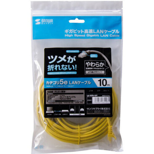 屈曲性能に優れた柔らかいツメを採用。しかもツメ折れ防止カバー付きのCAT5eギガビット対応LANケーブル●長さ/10m●結線/AWG26より線ツイストペアケーブル、ストレート全結線●色/イエロー●端子/RJ-45モールディングコネクタ付(ラッチカバー付き)●規格/エンハンスドカテゴリ5(1000BASE-T)、カテゴリ5(100BASE-TX)、カテゴリ3(10BASE-T)適合【ご注意事項】※こちらの商品は返品不可商品となります。※商品仕様につきましては、メーカーHPにてご確認ください。※仕入先直送品のため、在庫状況により上記お届け目安にてお届けできない場合がございます。※詳細納期をご確認されたい場合は、0120-812-069までご連絡ください。(お問い合わせ受付時間)月曜日~金曜日9時から18時30分(祝日を除く)