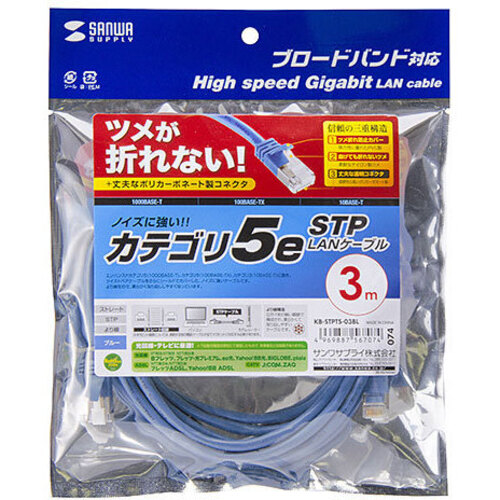 ノイズに強いシールドタイプ、ツメの折れないコネクタ採用のCAT5eSTP LANケーブル●長さ/3m●結線/より線仕様、ストレート全結線●色/ブルー●端子/RJ-45つめ折れ防止シールドコネクタ●規格/エンハンスドカテゴリ5(1000BASE-T)、カテゴリ5(100BASE-TX)、カテゴリ3(10BASE-T)適合【ご注意事項】※こちらの商品は返品不可商品となります。※商品仕様につきましては、メーカーHPにてご確認ください。※仕入先直送品のため、在庫状況により上記お届け目安にてお届けできない場合がございます。※詳細納期をご確認されたい場合は、0120-812-069までご連絡ください。(お問い合わせ受付時間)月曜日~金曜日9時から18時30分(祝日を除く)