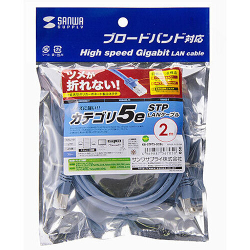 ノイズに強いシールドタイプ、ツメの折れないコネクタ採用のCAT5eSTP LANケーブル●長さ/2m●結線/より線仕様、ストレート全結線●色/ブルー●端子/RJ-45つめ折れ防止シールドコネクタ●規格/エンハンスドカテゴリ5(1000BASE-T)、カテゴリ5(100BASE-TX)、カテゴリ3(10BASE-T)適合【ご注意事項】※こちらの商品は返品不可商品となります。※商品仕様につきましては、メーカーHPにてご確認ください。※仕入先直送品のため、在庫状況により上記お届け目安にてお届けできない場合がございます。※詳細納期をご確認されたい場合は、0120-812-069までご連絡ください。(お問い合わせ受付時間)月曜日~金曜日9時から18時30分(祝日を除く)