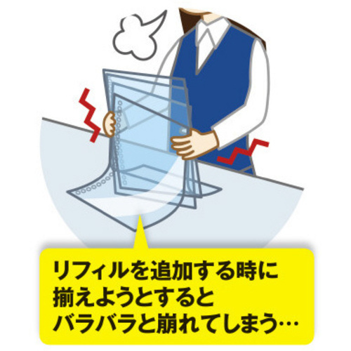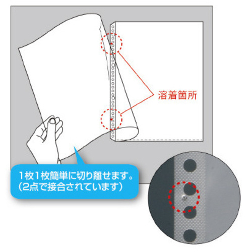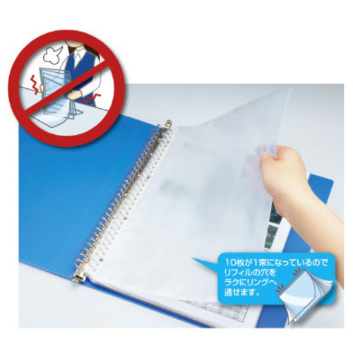 ●10枚を1回でスッと入れられるリフィル!10枚が1束になっているのでリフィルの穴をラクにリングへ通せます!多穴タイプのクリヤーブック用リフィルです。●サイズ/A4タテ●外寸法/タテ302×ヨコ235mm●内寸法/タテ297×ヨコ220mm●ポケット厚/0.06mm●ポケット表面/エンボス加工●中紙/なし●材質/再生PP●穴数/30穴(2・4穴対応)●単位(入数)/1パック(100枚入) 【ご注意事項】※1パック単位でお申し込みください。※10枚1束になっています。※製造時に発生するPP端材を一部原料として再利用いたします。※まれに乳白色の小さな点が見られる場合がございます。※この商品は、商品デザイン、パッケージが予告なく変更される場合があります。