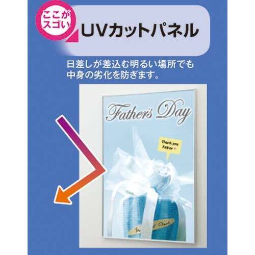 ●壁に掛けたまま一辺から差し込むだけだから、中身の出し入れ簡単。UVカットパネル採用で、日差しが差し込む明るい場所でも中身の劣化を防ぎます。●仕様/A1●セット用紙寸法/841×594mm●フレーム外寸法/845×598mm●フレーム幅/8mm●厚さ/20mm●質量/1.18kg●材質/フレーム:アルミ、表面:PET、背板:ダンボール●付属品/吊り紐、バックスプリング●単位(入数)/1セット(3枚入) 【ご注意事項】※透明板には保護シートが貼られていますので剥がしてからご利用下さい。付属のバックスプリングは4辺均等に全て取付下さい。付属の紐をご使用の場合は左右下辺にバランスよく取り付けて下さい。※1セット単位でお申し込みください。