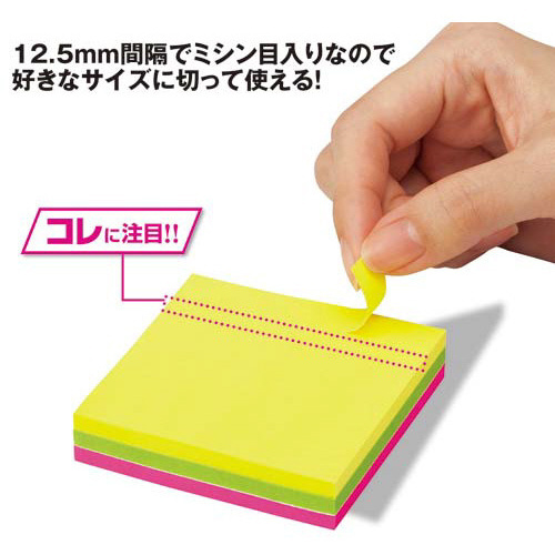 ●好きなサイズに切って使えるミシン目入りふせん!天のり仕様で、好きな色がどこからでもサッととれる、よく目立つネオンカラーふせん!●サイズ/75×75mm●カラー/3色(ネオンカラーアソート:イエロー・グリーン・ピンク)●1冊/150枚(1色:50枚入×3)●単位/1冊 【ご注意事項】※商品デザイン、パッケージ、仕様が予告なく変更される場合があります。