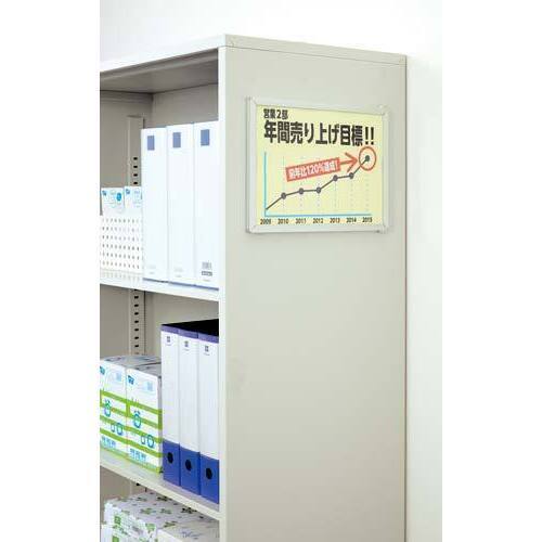 裏面にマグネットがついているので、フック不要でまっすぐキレイに掲示できます。軽量で丈夫なアルミフレ-ムは、ストライプの筋入りと無地のリバーシブルタイプ。●厚さ/10mm●フレーム幅/12mm●質量/260g●材質/フレーム:アルミ、表面:PET(0.4mm厚)、マグネット●付属品/吊り金具、テグス糸●仕様/A3●セット用紙寸法/420×297mm●フレーム外寸法/429×315mm●タテヨコ仕様(吊り下げ時はタテ仕様のみ)●単位/1セット(5枚入) 【ご注意事項】※紐で吊る場合はタテ仕様のみになります。ヨコ向きには掛けられません。※1セット単位でお申し込みください。