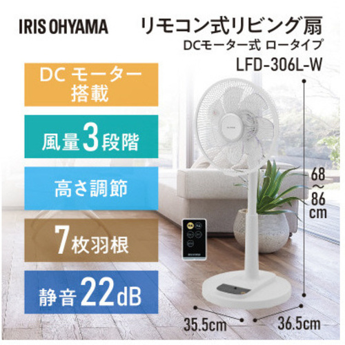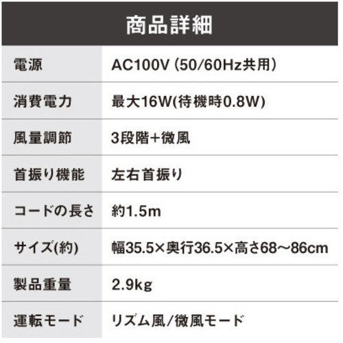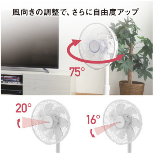 やさしい風からパワフルな風まで兼ね備えたリモコン式リビング扇です。エネルギー効率の良い、DCモーター採用で省エネです。超微風モード搭載で長時間でも疲れにくく、カラダを冷やしすぎません。●寸法/約幅355×奥行365×高さ680-860mm●コード長さ/約1.5m●羽根径/300mm●質量/約2.9kg●風量調節/3段階●角度調節/上20度・下16度(手動)、首振り:自動左右75度●タイマー/入:2・4・6時間、切:1・2・4時間●消費電力/16W●付属品/リモコン●保証期間/1年●本体カラー/ホワイト●リモコン/有り●単位/1台【ご注意事項】※取扱説明書をよくお読みのうえ、正しくご使用ください。【返品に関するご注意】※開封後はお客様のご都合による返品はお受けできません。【デジタルカタログ】※こちらの商品のデジタルカタログページは、画像下のリンクからご覧いただけます。