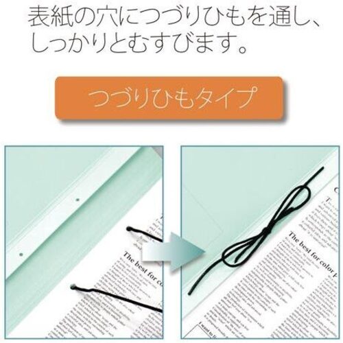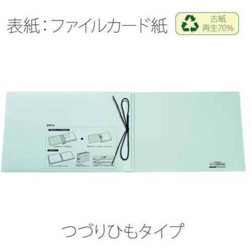 ●サイズ/A4ヨコ●寸法/縦215mm×横307mm×背幅18から98mm●表紙厚/約0.47mm●カラー/ブルー●材質/表紙:ファイルカード紙●付属品/つづりひも(70cm)●穴数/2穴●最大収容枚数/約800枚●単位(入数)/1冊