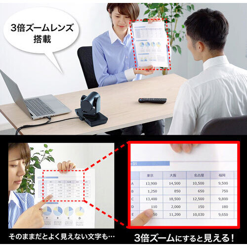 ビデオ会議に最適な3倍ズーム搭載会議用カメラ【ご注意事項】※こちらの商品は返品不可商品となります。※商品仕様につきましては、メーカーHPにてご確認ください。※仕入先直送品のため、在庫状況により上記お届け目安にてお届けできない場合がございます。※詳細納期をご確認されたい場合は、0120-812-069までご連絡ください。(お問い合わせ受付時間)月曜日~金曜日9時から18時30分(祝日を除く)