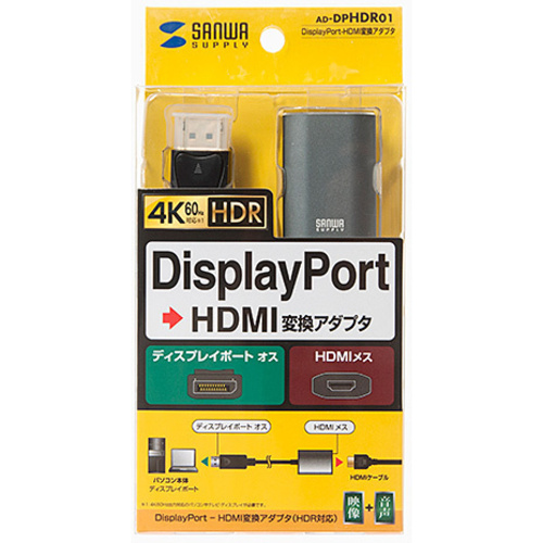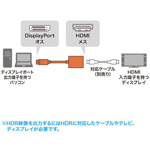 DisplayPortポートからHDMI入力のテレビやディスプレイに出力するための変換アダプタ●HDR対応【ご注意事項】※こちらの商品は返品不可商品となります。※商品仕様につきましては、メーカーHPにてご確認ください。※仕入先直送品のため、在庫状況により上記お届け目安にてお届けできない場合がございます。※詳細納期をご確認されたい場合は、0120-812-069までご連絡ください。(お問い合わせ受付時間)月曜日~金曜日9時から18時30分(祝日を除く)