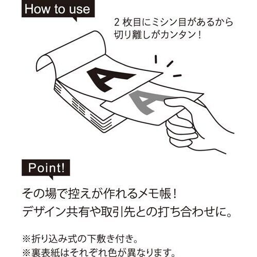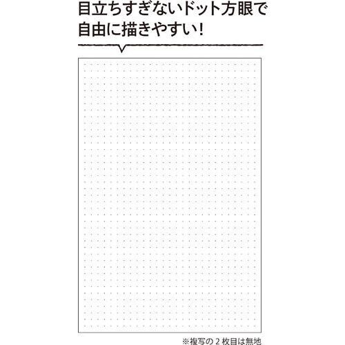 その場で控えが残せる複写式メモ帳。ドット方眼なので図も描きやすく取引先との打ち合わせ内容共有や伝言メモに!便利な折り込み式下敷き付。表紙は日本で古来より人気の淡い紅色。裏表紙は駱駝(ラクダ)色。●サイズ/A5●寸法/表紙210×140mm、内紙210×140mm●表紙色/薄紅(うすべに)●古紙パルプ配合率/●とじ枚数/40セット●罫/5mmドット方眼●紙質/上質紙●行数/●製本様式/糊綴じ●仕様/2枚複写●単位/1冊