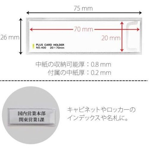 裏面にすぐ貼れる接着剤付。●寸法/幅75×高さ26mm●材質/ポリ塩化ビニル(PVC)(無移行性加工)●中紙サイズ/70×20mm●単位/1箱(100枚入)