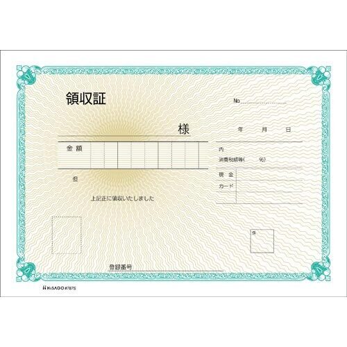 インボイス制度に対応したB6サイズの2枚複写の領収証です。税率を記入できるタイプです。クリアカットミシンでキレイに切り離せます。手が汚れにくいノーカーボン紙を使用。折り込み下敷き付き。●寸法/タテ128×ヨコ190mm(ミシン目切り離し寸法/タテ128×180mm)●複写枚数/2枚(2枚目は厚紙を使用)●組数/50組●刷色/黒●軽減税率/対応●単位/1冊