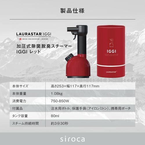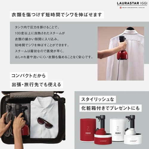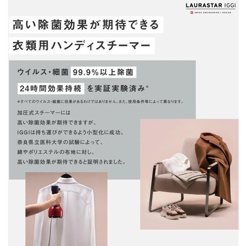 IGGIは片手で持てる除菌スチーマー。衣類などの布製品、日用品の除菌におすすめです。●寸法幅/11.7×奥行11.7×高さ25.3cm●質量/1.08kg●注水量/80ml●保証期間/1年間●消費電力(50・60Hz)/750-850W●スチームの圧力/約390kPa●コード長さ/1.8m●その他仕様/世界初除菌ができる加圧式衣類用ハンディスチーマー(加圧式衣類用ハンディスチーマーにおいて。2020年2月現在、Laurastar調べ) ※除菌 ウイルス除菌試験内容:【試験依頼先】奈良県立医科大学【試験材質】綿、ポリエステル布地、プラスチック【試験方法】噴射口をウイルス付着材質から1mm離して設置し、スチームを連続5秒噴射【試験結果】99.99%以上の除菌効果(試験は1種類のウイルスで実施)【試験報告書発行日】2020年10月16日●単位/1台 【返品に関するご注意】※開封後はお客様のご都合による返品はお受けできません。
