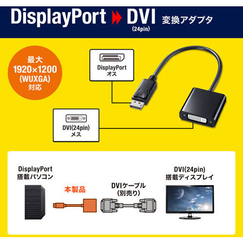 DisplayPortコネクタからのデジタル映像出力をDVIコネクタに変換できるDisplayPort-DVI変換アダプタ。●コネクタ形状/DisplayPortオス-DVIメス(DVI-D 24pinメス)●シールド方法/3重シールド●ケーブル長/約0.2m●ケーブル径/5.5mm●重量/約44g●主な対応解像度/1920×1200、1920×1080、1600×1200【ご注意事項】※こちらの商品は返品不可商品となります。※商品仕様につきましては、メーカーHPにてご確認ください。※仕入先直送品のため、在庫状況により上記お届け目安にてお届けできない場合がございます。※詳細納期をご確認されたい場合は、0120-812-069までご連絡ください。(お問い合わせ受付時間)月曜日~金曜日9時から18時30分(祝日を除く)