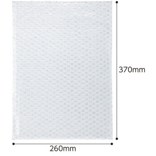 長3サイズの袋状の緩衝材。規格封筒にセットするだけで、捨てる時も分別できるクッション封筒に●寸法/幅260×深さ370mm●材質/ポリエチレン●カラー/透明●空気粒サイズ(1粒)/直径約10×高さ約3.5mm●構造/2層●タイプ/袋状●目安サイズ/角1封筒サイズ●包装寸法/幅260×奥行370×高さ110mm●単位/1セット(30枚入×10) 【ご注意事項】※1セット単位でお申し込みください。