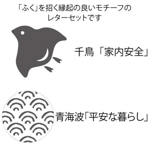 「ふく」を招く縁起の良い千鳥柄のレターセットです。一筆箋感覚で使える小さな便箋とL判写真も入る封筒に、封かんやデコレーションに使えるシールが付いています。和風で上品なかわいさにこだわりました。●寸法/パッケージ/タテ156×ヨコ122×奥行5mm便箋/タテ140×ヨコ100mm封筒/タテ150×ヨコ110mm●仕様/便箋/12枚入封筒/4枚入シール/1シート入〔PP袋入〕●罫/●紙質/和紙製●単位/1パック