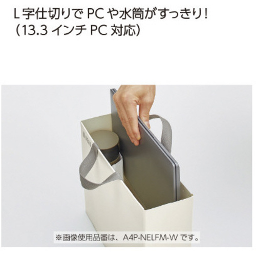 ワークツールをすっきりひとまとめ。中仕切りでサッとしまえる。●サイズ/A4●カラー/ブラック●寸法/仕切り内(幅×奥行×高さmm):80×76×182●寸法(幅×奥行×高さmm)/外寸法:328×102×260、内寸法:326×95×259●収容可能寸法/13.3インチノートPC収容可能●材質/本体:再生PP、取っ手:ポリエステル●耐荷重/約49N(約5kgf)●単位/1個 【ご注意事項】※本製品は、収容物を保証する設計にはなっておりません。落下などによる電子機器などの破損・故障・傷については責任を負いかねますのでご了承ください。※素材の特性上、摩擦や水濡れにより色移りする場合があります。※有機系や揮発性の溶剤が付着しますと反り・変色するおそれがあります。※平らでない場所に置いたり机の端などに置かないでください。※容量・耐荷重を超えるものは、変形・破損の原因になりますので無理に詰め込まないでください。※ペットボトルなどを入れる際、水滴をよくふき取って収容ください。※上端部を超える高さのものを入れる際は転倒にご注意ください。