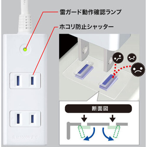 雷ガードを内蔵しており、接続機器を雷から守ります。雷ガード作動中は確認ランプが点灯します。●バリスタ電圧/470V●制限電圧/775V●サージ耐量/2500A●サイズ/W102×D40×H23mm【ご注意事項】※こちらの商品は返品不可商品となります。※商品仕様につきましては、メーカーHPにてご確認ください。※仕入先直送品のため、在庫状況により上記お届け目安にてお届けできない場合がございます。※詳細納期をご確認されたい場合は、0120-812-069までご連絡ください。(お問い合わせ受付時間)月曜日~金曜日9時から18時30分(祝日を除く)
