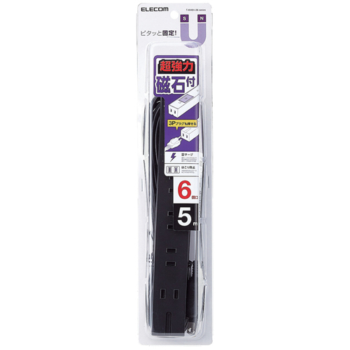オフィスやご家庭など、さまざまなシーンで使いやすいマグネット、ほこり防止シャッター、雷サージ付電源タップ。●未使用時にほこりの侵入を防止する「ほこり防止シャッター」を装備した電源タップです。●また、差込口には耐熱性に優れたユリア樹脂を使用しており、万一の発熱の際にも融解しにくく、電気火災の防止に有効です。●タップ底面の超強力なネオジム磁石でしっかり固定できます。●トラッキング現象による火災の防止に役立つ絶縁キャップ付きのコンセントプラグを採用しています。●本体差込口形状:2ピン(側面に設置した1個口のみ3ピン対応※アース機能はありません)●本体差込口個数:6個口●プラグ仕様:2ピン●コード長:5.0m●定格:125V・15A・1500W●雷ガード:○●ほこりシャッター:○●絶縁キャップ付きプラグ:○●二重被ふく:○●スイングプラグ:○●マグネット:○●カラー:ブラック●材質:本体:ABS樹脂/プラグ:PVC/差込口:ユリア樹脂●外形寸法:幅34mm×奥行252mm×高さ28mm※コード部分及びプラグ部分を除く●質量:約530g●使用可能地域:本製品は日本国内の電源を想定して設計されていますので、日本国外ではご使用いただけません。●電気用品安全法:PSE適合【ご注意事項】※こちらの商品は返品不可商品となります。※商品仕様につきましては、メーカーHPにてご確認ください。※仕入先直送品のため、在庫状況により上記お届け目安にてお届けできない場合がございます。※詳細納期をご確認されたい場合は、0120-812-069までご連絡ください。(お問い合わせ受付時間)月曜日~金曜日9時から18時30分(祝日を除く)