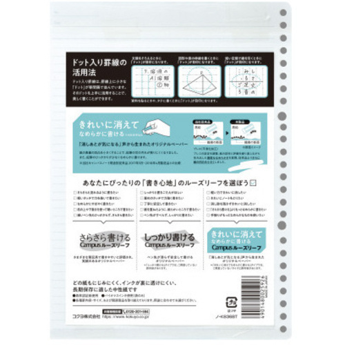「消しあとが気になる」声から生まれたオリジナルペーパー。紙の表面の凹凸を小さくすることで、鉛筆の芯の汚れが残りにくくなりました。鉛筆のひっかかりが少なくなめらかに書けます。●サイズ/B5●種別/罫幅6mm(ドット入り)(36行)●セット内容/100枚●寸法(タテ×ヨコ)/257×182mm●穴数/26穴(丸穴)●罫内容/ドット入り●罫/6mm幅●行数/36行●枚数/100枚●紙厚/0.10mm程度●紙質/上質紙(森林認証紙)●坪量/70g/平方メートル●単位/1冊 【ご注意事項】※この商品は、商品デザイン、パッケージが予告なく変更される場合があります。