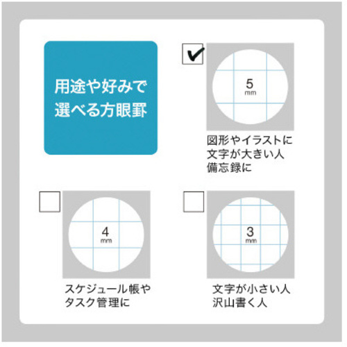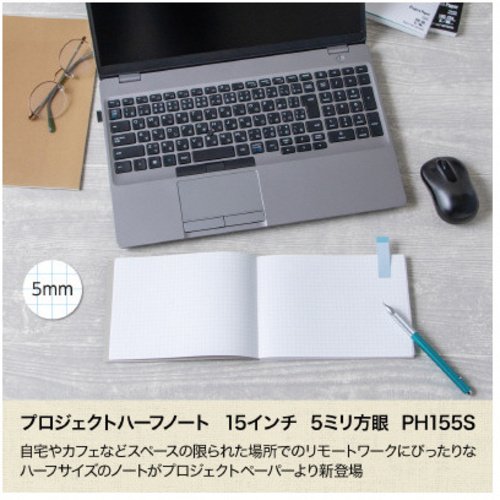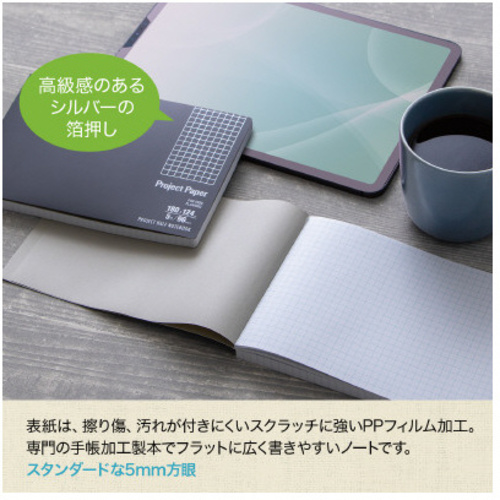 自宅やカフェなど限られたスペースでのリモートワークでも使いやすい、ハーフサイズのプロジェクトノート。15インチのノートパソコンの横幅にもぴったり。●寸法(タテ×ヨコ)/124×180mm●枚数/96枚●罫内容/5mm方眼●表紙カラー/ブラック●罫色/ブルー●単位/1冊