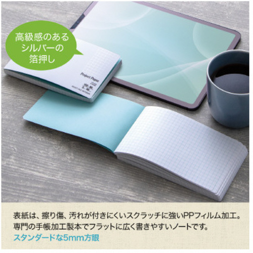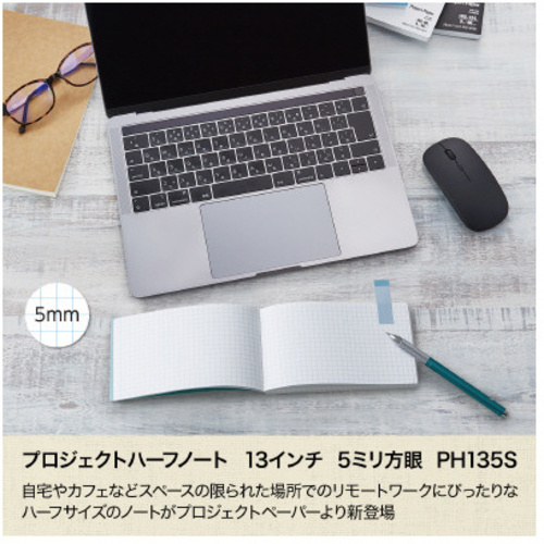 フリーアドレスや、自宅やカフェなど限られたスペースでのリモートワークでも使いやすい、ハーフサイズのプロジェクトノート。13インチのノートパソコンの横幅にもぴったり。●寸法(タテ×ヨコ)/90×150mm●枚数/96枚●罫内容/5mm方眼●表紙カラー/ホワイト●罫色/ブルー●単位/1パック(3冊入)