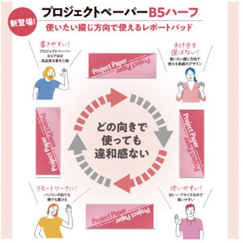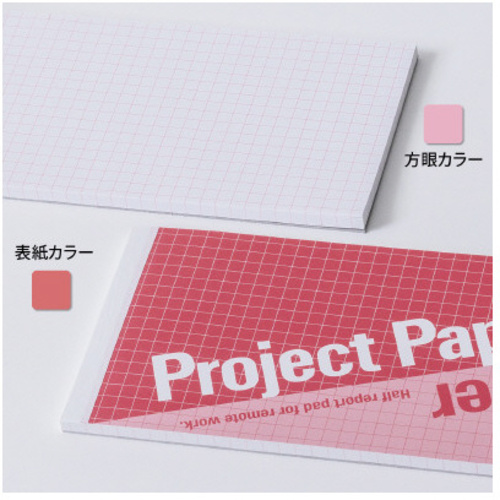 使う人が使いたい綴じ方向で使える表紙デザイン。フリーアドレスやリモートワークなど限られたスペースでも使いやすい、プロジェクトペーパーB5ハーフサイズ。●サイズ/B5ハーフ●枚数/50枚●寸法(タテ×ヨコ)/91×257mm●罫内容/5mm方眼●表紙カラー/インカローズ●方眼カラー/インカローズ●単位/1冊 【ご注意事項】※色を楽しんでいただくことを想定している商品のため罫線色によりコピーに写ります。