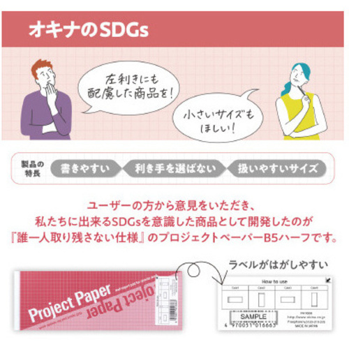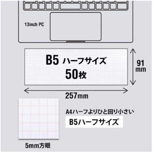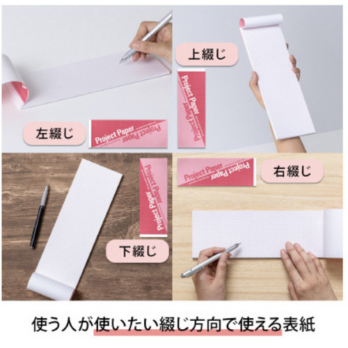 使う人が使いたい綴じ方向で使える表紙デザイン。フリーアドレスやリモートワークなど限られたスペースでも使いやすい、プロジェクトペーパーB5ハーフサイズ。●サイズ/B5ハーフ●枚数/50枚●寸法(タテ×ヨコ)/91×257mm●罫内容/5mm方眼●表紙カラー/インカローズ●方眼カラー/インカローズ●単位/1パック(5冊入) 【ご注意事項】※色を楽しんでいただくことを想定している商品のため罫線色によりコピーに写ります。