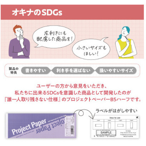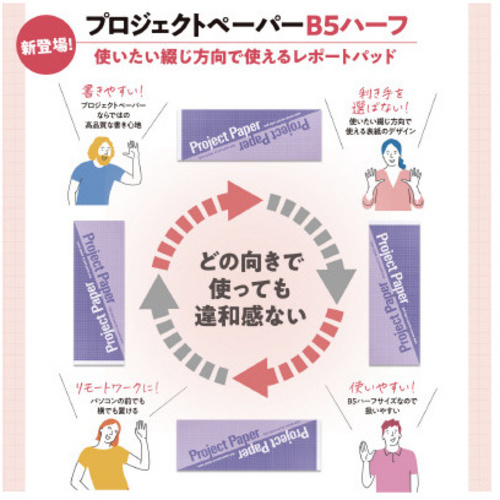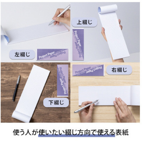 使う人が使いたい綴じ方向で使える表紙デザイン。フリーアドレスやリモートワークなど限られたスペースでも使いやすい、プロジェクトペーパーB5ハーフサイズ。●サイズ/B5ハーフ●枚数/50枚●寸法(タテ×ヨコ)/91×257mm●罫内容/5mm方眼●表紙カラー/タンザナイト●方眼カラー/タンザナイト●単位/1冊 【ご注意事項】※色を楽しんでいただくことを想定している商品のため罫線色によりコピーに写ります。