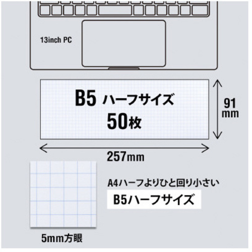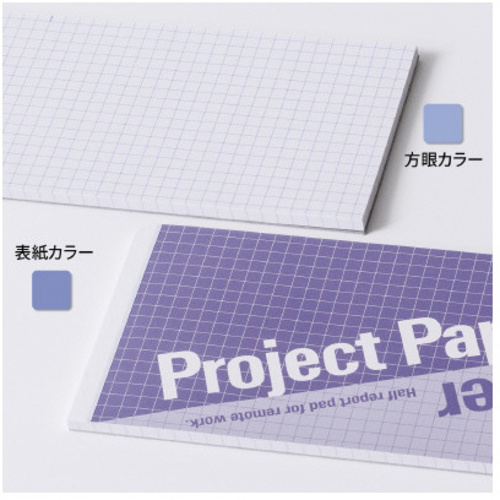 使う人が使いたい綴じ方向で使える表紙デザイン。フリーアドレスやリモートワークなど限られたスペースでも使いやすい、プロジェクトペーパーB5ハーフサイズ。●サイズ/B5ハーフ●枚数/50枚●寸法(タテ×ヨコ)/91×257mm●罫内容/5mm方眼●表紙カラー/タンザナイト●方眼カラー/タンザナイト●単位/1パック(5冊入) 【ご注意事項】※色を楽しんでいただくことを想定している商品のため罫線色によりコピーに写ります。