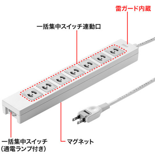 2P抜け止め7個口、集中スイッチ、マグネット、雷ガード付き。ネームタグ、専用コンセントキャップ付属【ご注意事項】※こちらの商品は返品不可商品となります。※商品仕様につきましては、メーカーHPにてご確認ください。※仕入先直送品のため、在庫状況により上記お届け目安にてお届けできない場合がございます。※詳細納期をご確認されたい場合は、0120-812-069までご連絡ください。(お問い合わせ受付時間)月曜日~金曜日9時から18時30分(祝日を除く)