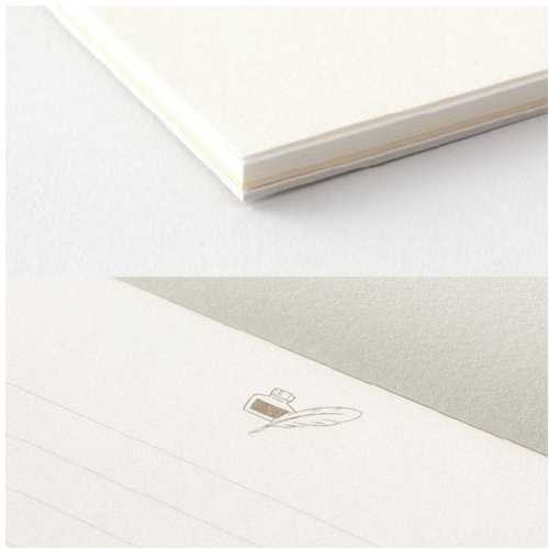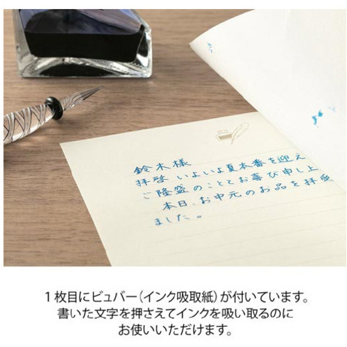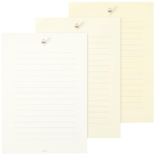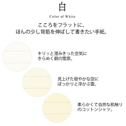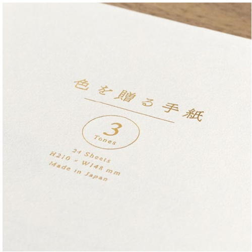 気分や情景を色に込めて贈る便箋。その日の気分、伝えたい情景から連想する色を選んで手紙を書けます。1枚目の白い紙はビュバー(インク吸取紙)で、書いた文字を押さえてインクを吸い取るのにお使いいただけます。●寸法/本体/タテ210×ヨコ148×奥行5mm●仕様/24枚入(3色×8枚)15行インク吸取紙1枚付●罫/横罫●単位/1パック