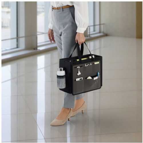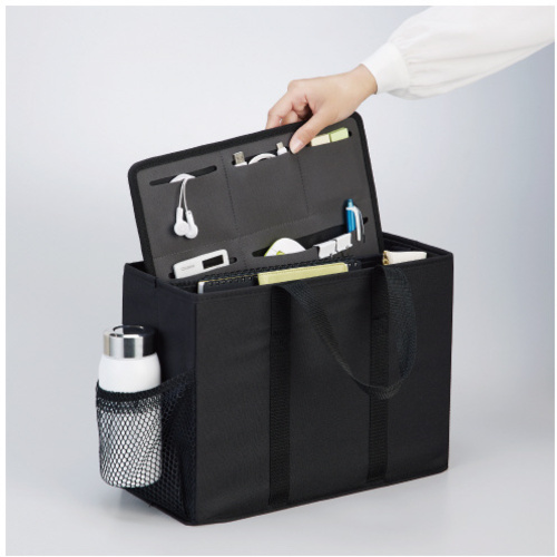 【取り外し可能で机上に自立するサブバッグ付き。マウスやケーブル等の整理に!】社内移動に便利な布製バッグ。モバイル端末や書類などを同時に運べる!収納時はコンパクト!●種別/スタンダード(サブバッグ付)●カラー/ブラック●外寸法/本体:幅348×奥行153×高さ260mm、サブバッグ:幅330×奥行10×高さ255mm、●内寸法/本体:幅335×奥行148×高さ245mm●持ち手の長さ/460mm●材質/本体:ポリエステル、芯材:板紙、サブバッグ:ポリエステル・ネオプレーン●耐荷重/本体:7kg●機能/メッシュポケット付き、可動仕切板付き、サブバッグ付属●折りたたみ時寸法/幅348×奥行45×高さ260mm●単位/1個 【ご注意事項】※この商品は、商品デザイン、パッケージが予告なく変更される場合があります。※当バッグは防水仕様ではありません。【デジタルカタログ】※こちらの商品のデジタルカタログページは、画像下のリンクからご覧いただけます。