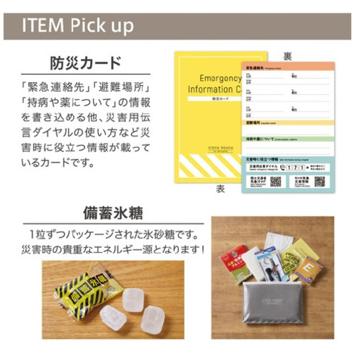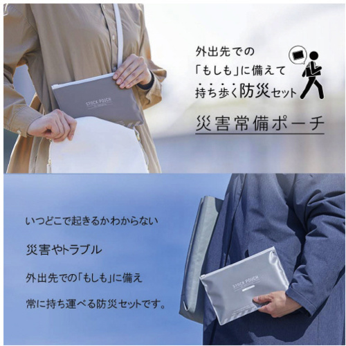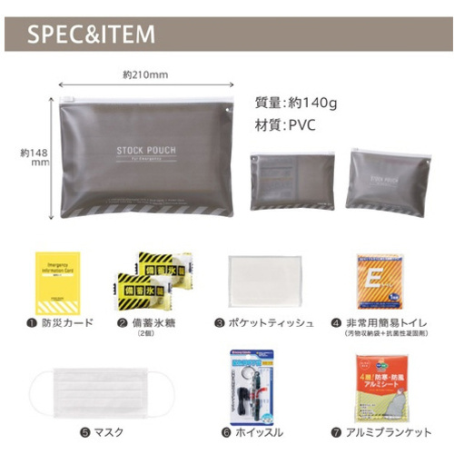 外出先での「もしも」に備えて持ち歩く防災セット●セット内容/防災カード、備蓄氷糖(2個)、ポケットティッシュ、非常用簡易トイレ(汚物収納袋+抗菌性凝固剤)、マスク、ホイッスル、アルミブランケット●ポーチサイズ/約210(W)×148(H)mm●重量/約140g●ポーチ材質/PVC●単位/1個 【ご注意事項】※直接日光の当たる場所や、高温・多湿の場所での使用または保管はしないでください。