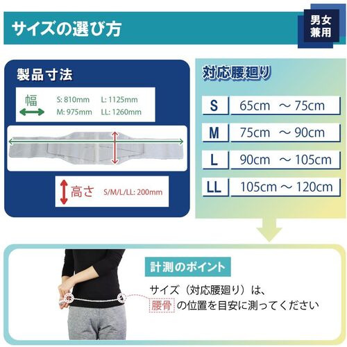 ●腰部固定帯。●医療現場で採用されている信頼の品質です。●洗濯可能。(手洗い。中性洗剤をご使用ください。)●上下対称構造のため、正面接着部分をご自身の使いやすい合わせ向き(右前or左前)で装着できます。●正面と補助ベルトの面ファスナー接着部分の端に、『take off zone』非接着部分があるため、着脱しやすくなっています。●伸縮部分・非伸縮部分ともに、通気性を重視したメッシュ素材採用してます。●4本のステーを体型に添うように腰部の中心にフィットさせることで効果的にサポートします。(ステーは取外し出来ません)●弾力性のある特殊樹脂の為、追従性に優れています。体型ラインに密着させるため凸型断面になっています。●平ゴムタイプで伸縮性に優れています。腹斜筋に添った補助ベルトは腹圧を高め、下腹部を引き上げて腰部への負担を軽減します。●樹脂ステーの上から留めるため、よりフィット感が得られます。●動きやすさ・通気性・ホールド性の3つの機能をバランスよく実現した形状です。●腹部の幅を狭くしています。前屈制限が少なく、しかも胃に負担をかけません。●背部の幅が広くなっています。過伸展を防ぎ背筋を補助します。●色:ホワイト●サイズ:LL(適応腰まわり105cm~120cm)●材質:ナイロン・綿・ゴム・ポリエステル・ポリウレタン・樹脂ステー【ご注意事項】※こちらの商品は返品不可商品となります。※商品仕様につきましては、参考情報ページにてご確認ください。※仕入先直送品のため、在庫状況により上記お届け目安にてお届けできない場合がございます。※詳細納期をご確認されたい場合は、0120-812-069までご連絡ください。(お問い合わせ受付時間)月曜日~金曜日9時から18時30分(祝日を除く)