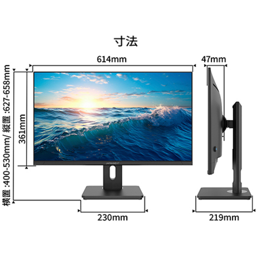 ●サイズ/27型●液晶パネル方式/IPS(AHVA)パネル●表示色/1677万色sRGB90%/DCI-P372%●ピッチ/約0.311mm●解像度/1920×1080●輝度/350cd/m2●コントラスト比/1000:1●視野角/H:178oV:178o●入力信号/デジタル●入力端子/HDMI×1、DP×1、Type-C×1●ケーブル/HDMIケーブル、Type-Cケーブル、電源ケーブル●スピーカー/あり2W×2●本体サイズ(H×W×D)/高横400-530/縦627-658mmx幅横614/縦361mmx奥行219mm●本体重量/約4.75Kg●本体カラー/ブラック●電源/AC100-240V50/60Hz●最大消費電力/96W【ご注意事項】※こちらの商品は返品不可商品となります。※商品仕様につきましては、メーカーHPにてご確認ください。※仕入先直送品のため、在庫状況により上記お届け目安にてお届けできない場合がございます。※詳細納期をご確認されたい場合は、0120-812-069までご連絡ください。(お問い合わせ受付時間)月曜日~金曜日9時から18時30分(祝日を除く)
