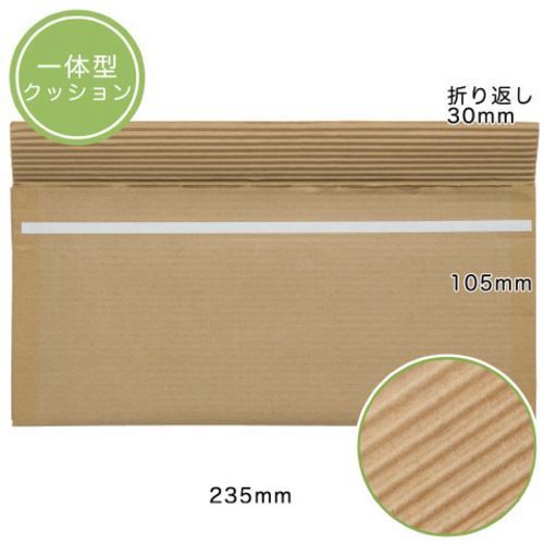 クッション性のある一体型紙クッション・地球に優しい国産クラフト紙を使用●寸法/235×105+30mm●サイズ/定型郵便物●内寸法/225×95mm●厚さ/6mm●質量/12g●材質/クラフト紙●種別/宅配封筒●生産国/日本●単位/1セット(10枚入×10)●単位/1セット(10枚入)×10 【ご注意事項】※この商品は、商品デザイン、パッケージが予告なく変更される場合があります。※粘着テープは仮止め用です。別途OPPやセロテープ等で止めて下さい。※緩衝性のある封筒ですが内容物の保護を確約するものではありません。