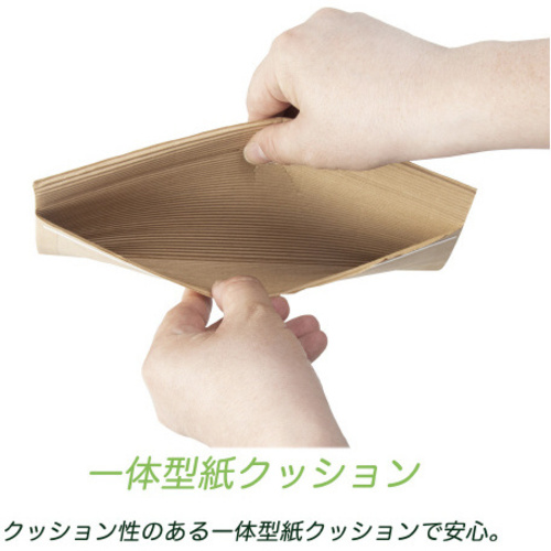 クッション性のある一体型紙クッション・地球に優しい国産クラフト紙を使用●寸法/235×105+30mm●サイズ/定型郵便物●内寸法/225×95mm●厚さ/6mm●質量/12g●材質/クラフト紙●種別/宅配封筒●生産国/日本●単位/1パック(10枚入) 【ご注意事項】※この商品は、商品デザイン、パッケージが予告なく変更される場合があります。※粘着テープは仮止め用です。別途OPPやセロテープ等で止めて下さい。※緩衝性のある封筒ですが内容物の保護を確約するものではありません。